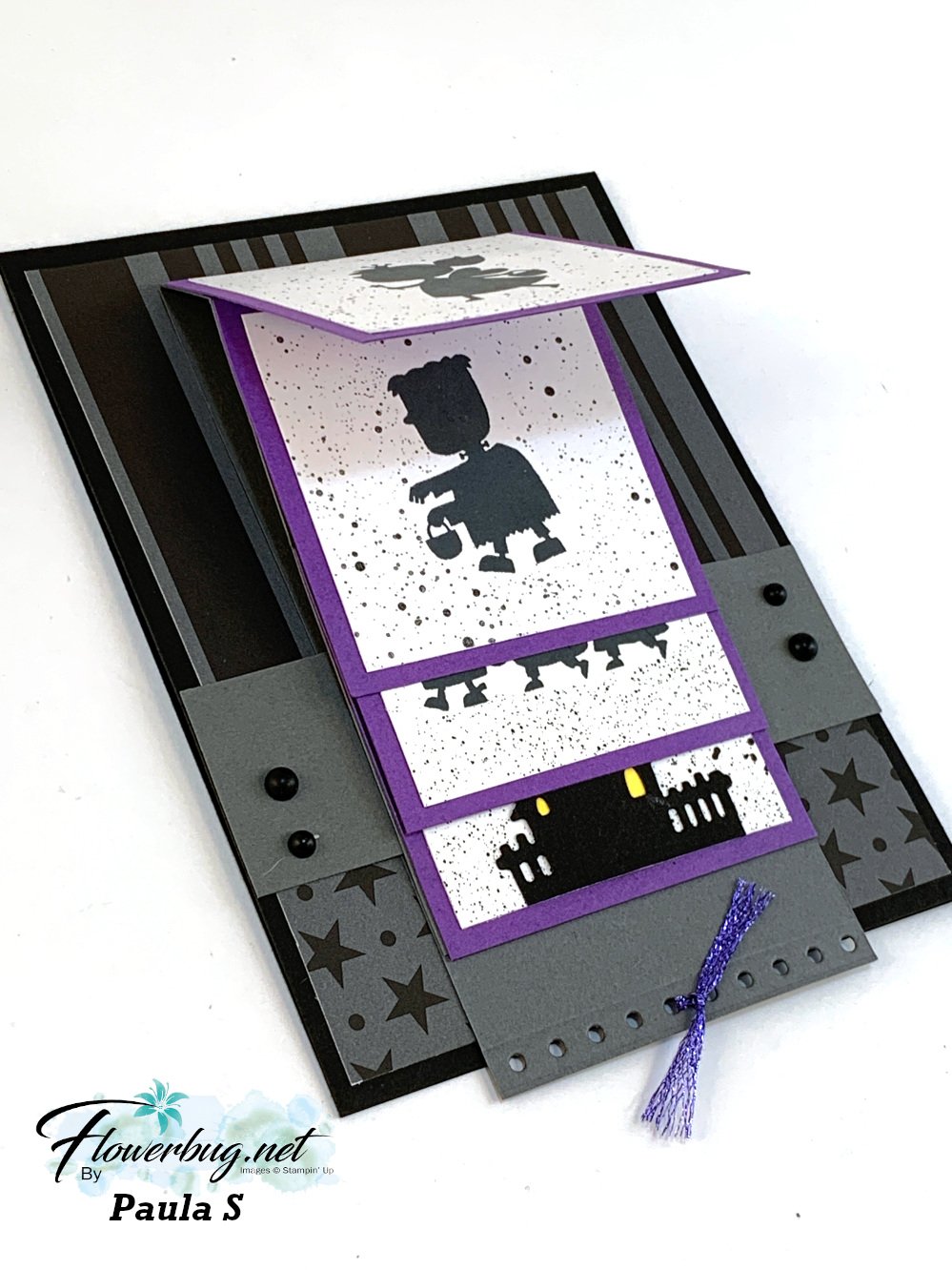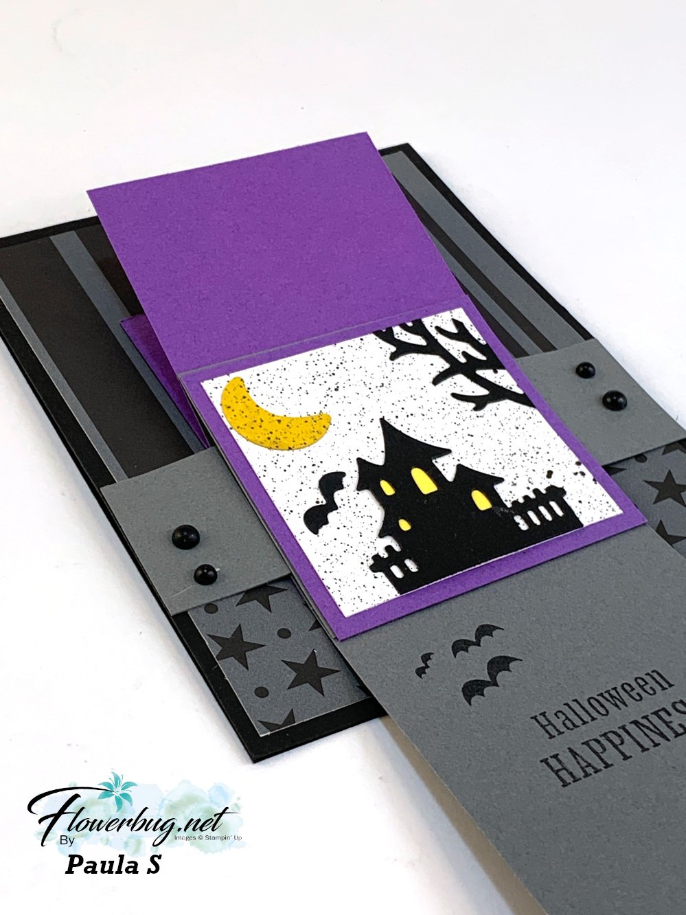 Here's a peak of the last inside panel with the die-cut & spooky scene.  She stamped the greeting on the long inside strip.